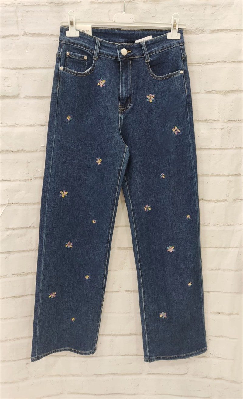 Vaquero ancho flor bordada
