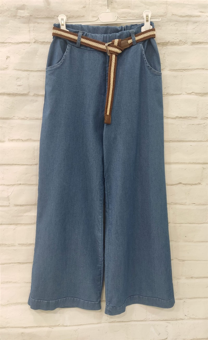 Pantalón de pierna ancha con goma en la cintura. Con bolsillos y cinturón. Composición: 95% algodón y 5% elastano.