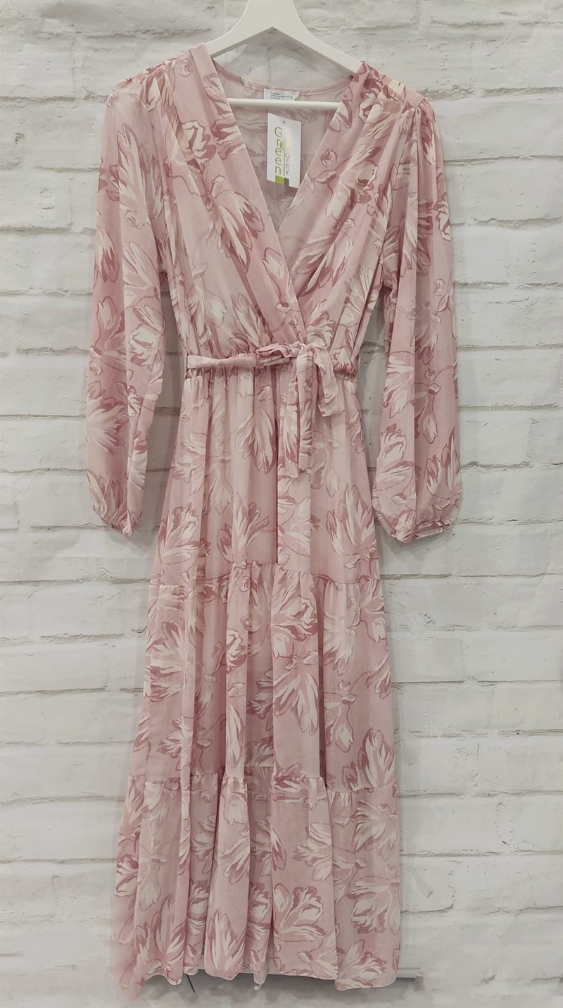 Vestido de escote cruzado, manga larga con goma en el puño y cinturón de la misma tela. Composición: 100% poliester.
