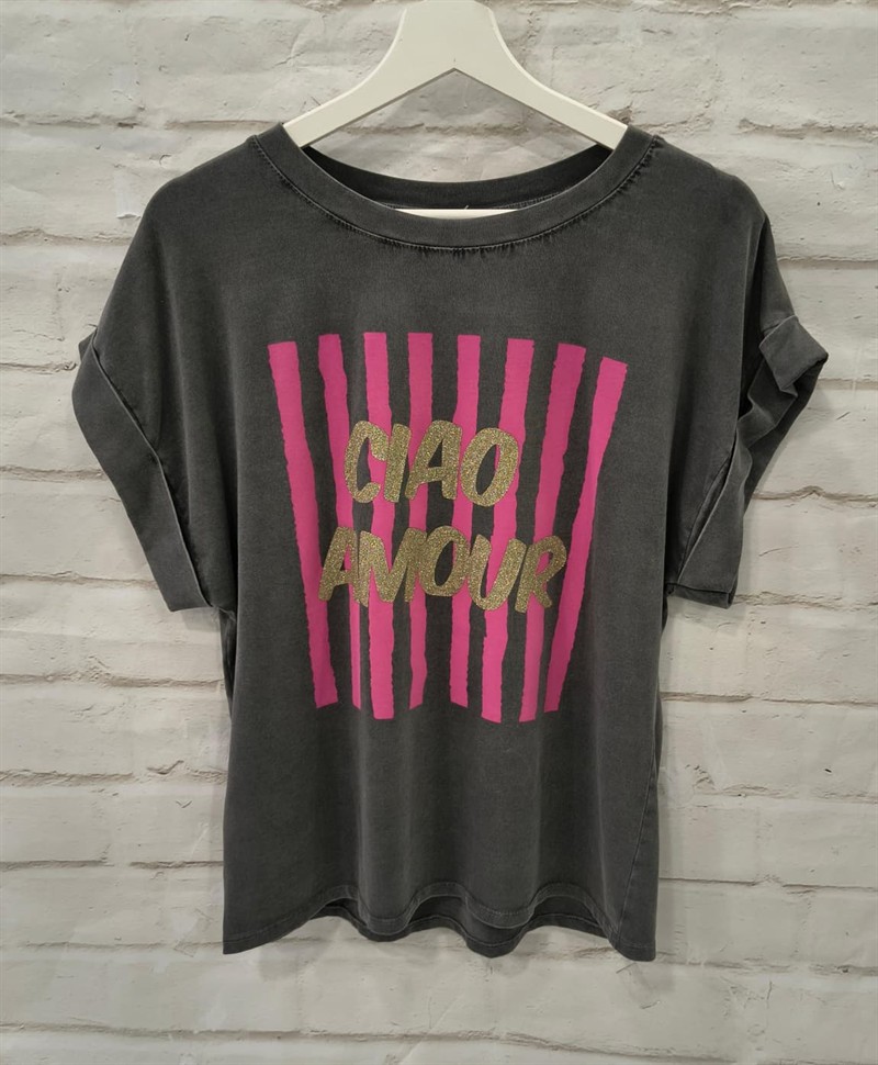 Camiseta de chica en gris estilo lavado, con diseños estampados. Composición: 90% Algodón. 10% Elástico