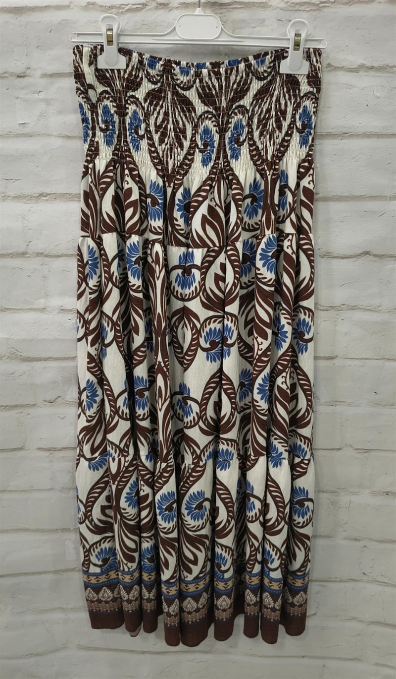 Falda larga de chica estampada, con banda elástica. Composición: 100% Viscosa.