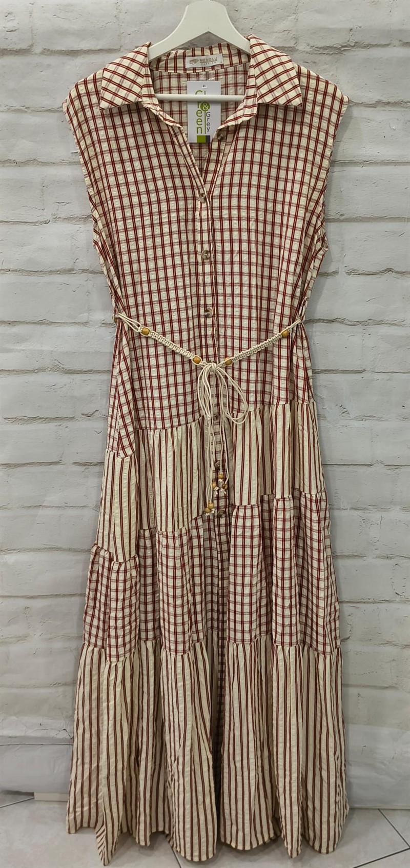 Vestido largo de verano a cuadros, manga corta y cinturón. Composición: 50% Algodón, 40% Poliester, 10% Viscosa