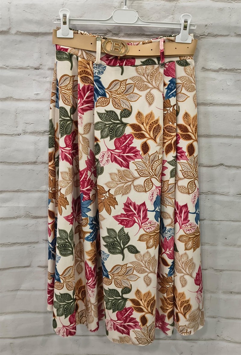 Falda larga plisada, en colores claros, estampado de flores coloridas y con cinturón. Composición: 50% Viscosa, 50% Poliester